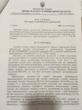 В ответ Терещенко опубликовала решение прокуратуры Харьковской области о закрытии уголовного производства против нее от 25 апреля 2019 года, в котором дело закрыто из-за отсутствия состава преступления.