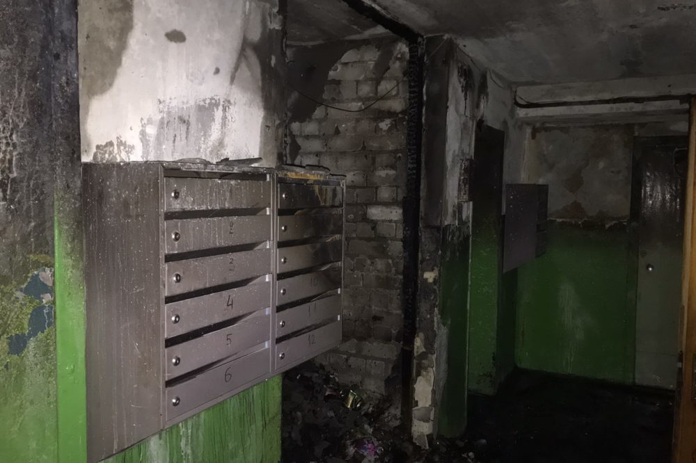 К месту происшествия выехали направлены два отделения спасателей на автоцистернах и одна пожарная автолестница. На момент прибытия пожарных на первом этаже в подсобном помещении горели двери в мусоросборник и входные двери в лестничную клетку на площади 6 кв.м.