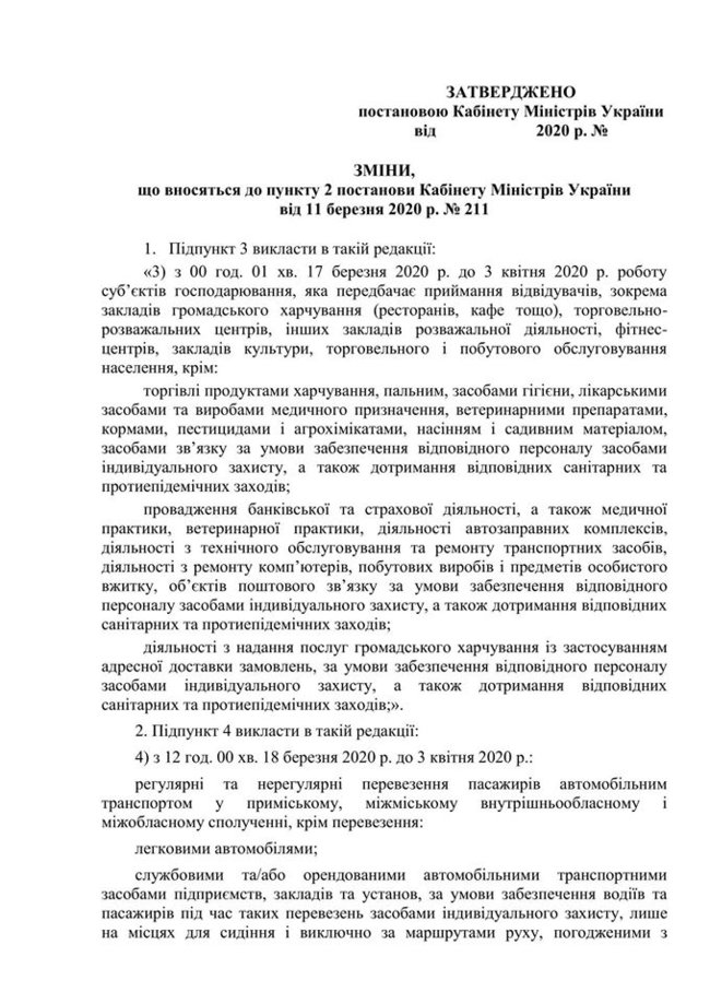 Кабинет Министров внес изменения в свое постановление относительно того, какой бизнес может работать в условиях предотвращения распространения коронавируса в Украине (карантина).