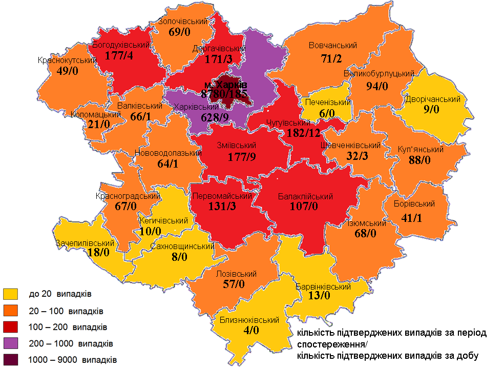 Наибольшее количество заболевших зарегистрировано в Харькове – 8780 случаев, 185 из них — за минувшие сутки. В Харьковском районе COVID-19 болеют 628 человек.