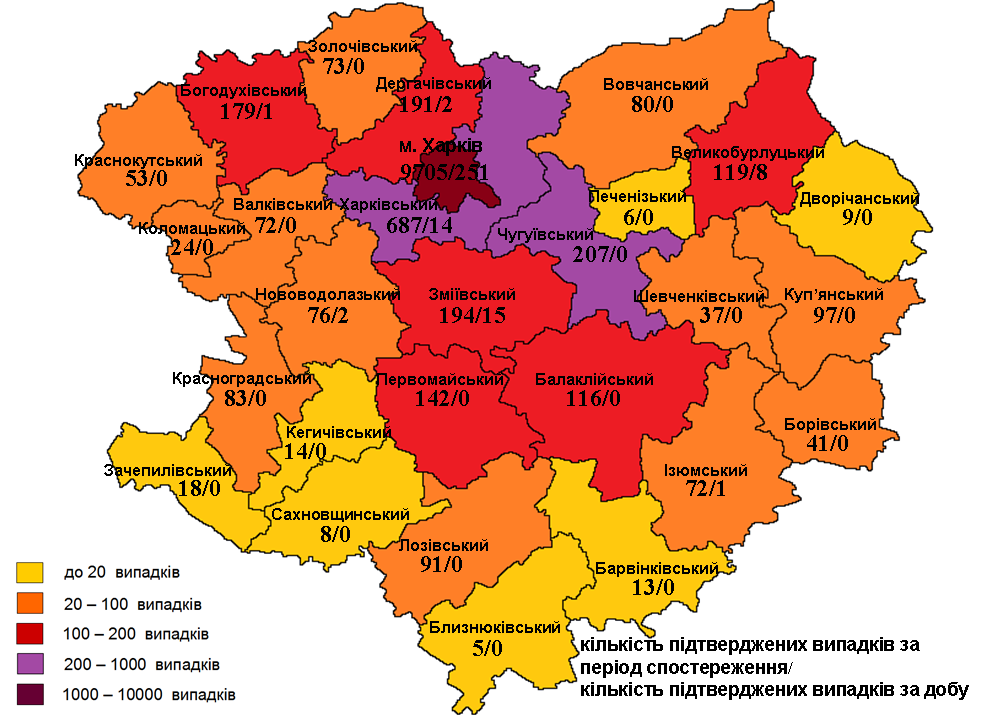 Наибольшее количество заболевших зарегистрировано в Харькове – 9705 случаев, 251 из них — за минувшие сутки. В Харьковском районе COVID-19 болеют 687 человека.