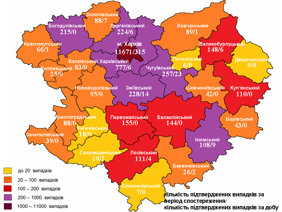Наибольшее количество заболевших зарегистрировано в Харькове — 11 671 случай, 315 из них — за минувшие сутки. В Харьковском районе с начала пандемии зарегистрирован 777 больной COVID-19.