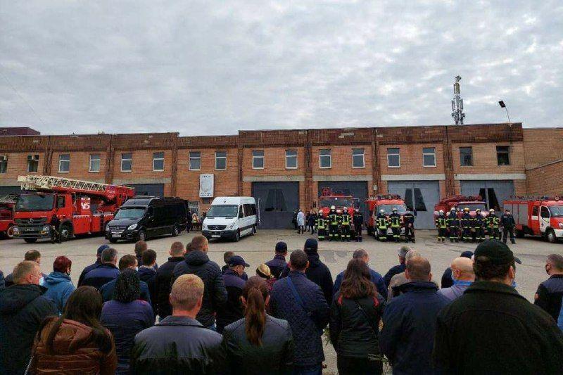 Во время церемонии прощания на спецавтомобилях ГСЧС включили сирену в знак памяти и скорби о погибшем спасателе.