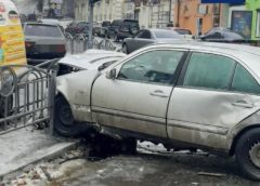 В результате столкновения Mercedes врезался в ограду, отделяющую тротуар от проезжей части.