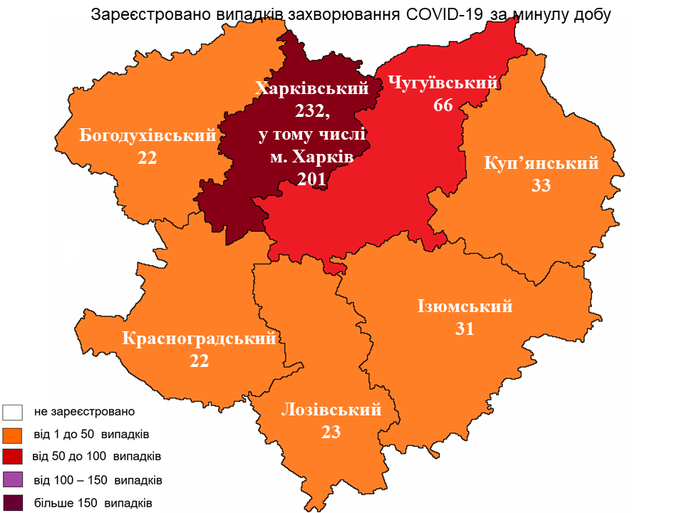 За минувшие сутки наибольшее количество заболевших зарегистрировано, как и всегда, в Харьковском районе — 232, в том числе 201 — в Харькове.