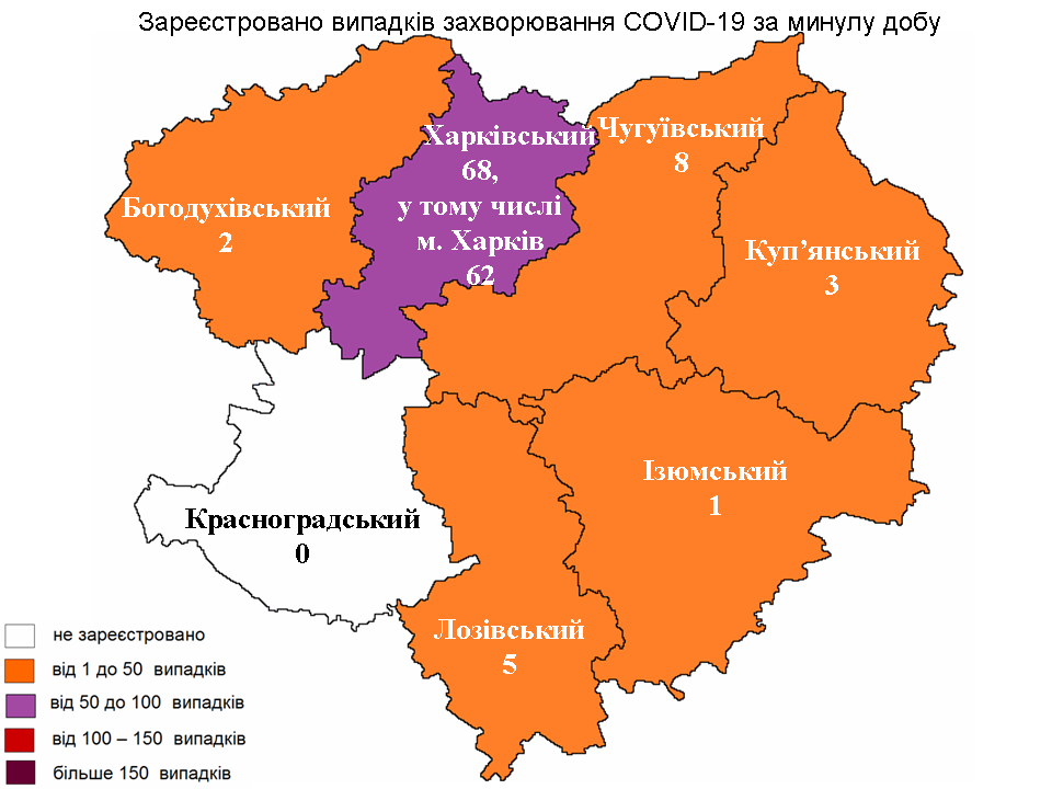 За минувшие сутки наибольшее количество заболевших зарегистрировано, как и всегда, в Харьковском районе — 68, в том числе 62 — в Харькове.
