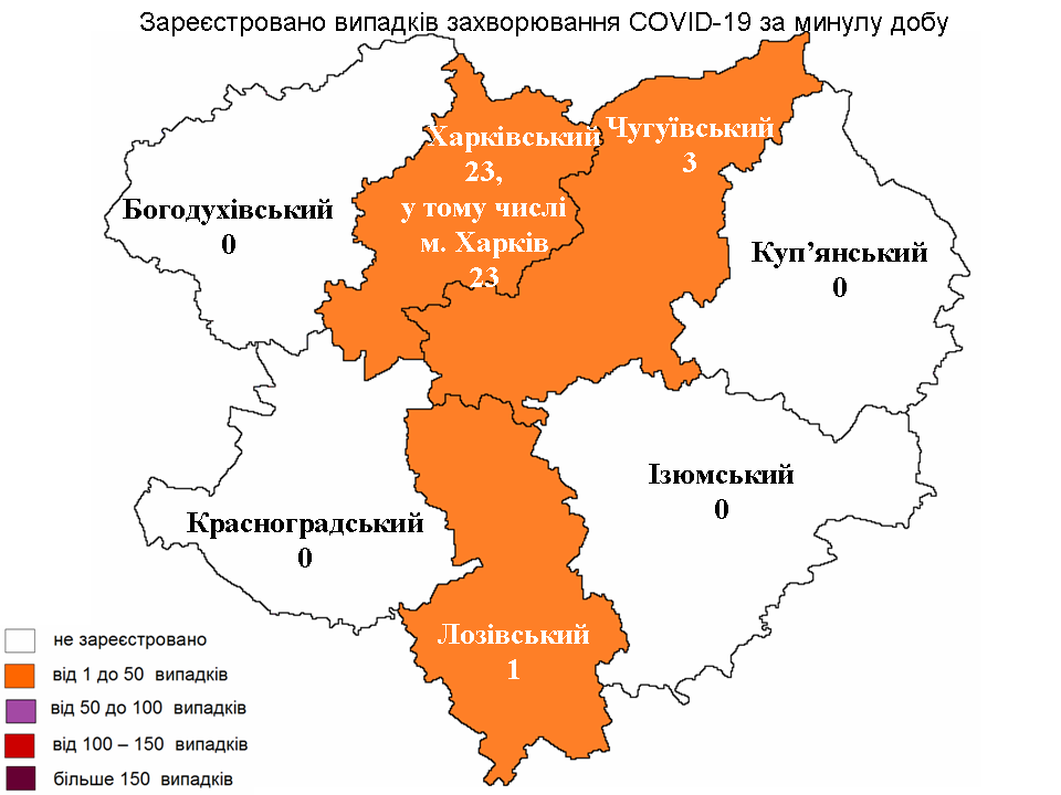 За минувшие сутки наибольшее число заболевших выявили в Харьковском районе. Все заболевшие — жители города Харькова (23). Три новых случая COVID-19 выявили в Чугуевском районе и еще один — в Лозовском.
