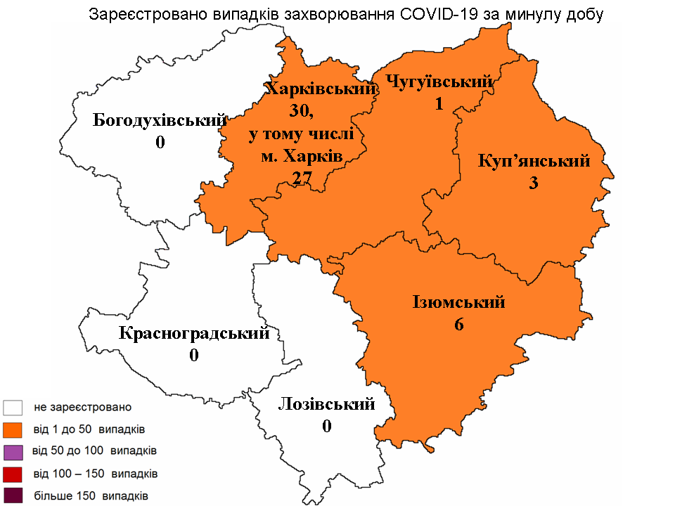 Наибольшее число новых случаев выявлено в Харьковском районе — 30 заболевших, 27 из них — харьковчане. В Изюмском районе заболели шесть жителей, в Купянском — три и в Чугуевском — один заболевший.