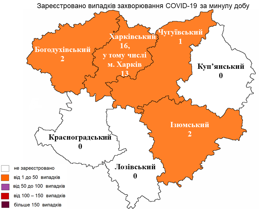 За минувшие сутки случаи заболевания коронавирусом выявлены в Харьковском районе — 16 заболевших, 13 из них — жители г. Харькова. В Богодуховском и Изюмском районах вывили по два новых случая. В Чугуевском районе заболел один человек.
