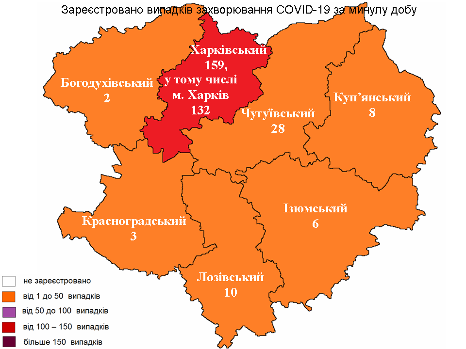 За минувшие сутки наибольшее количество больных COVID-19 зарегистрировали в Харьковском районе — 159 случаев, 132 — среди жителей Харькова. В Чугуевском районе заболели 28 жителей, в Лозовском — 10 заболевших, в Купянском — восемь. В Изюмском районе выявили шесть новых случаев, Красноградском — три и в Богодуховском — два.