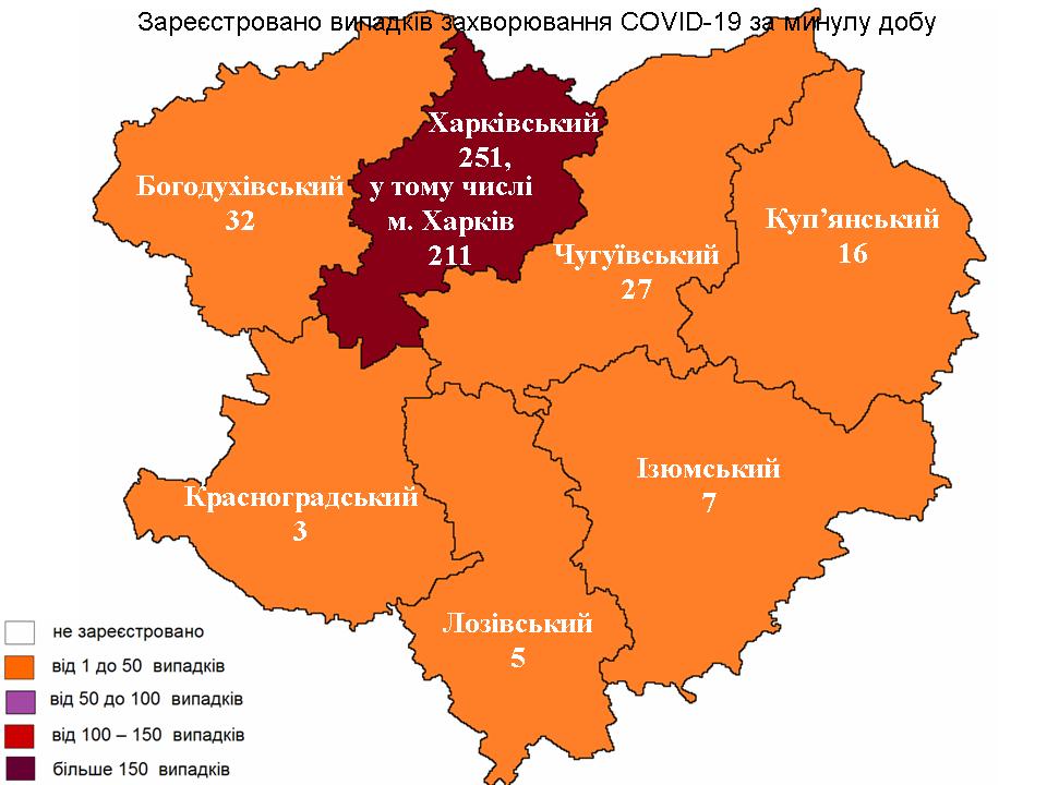 За минувшие сутки наибольшее количество больных COVID-19 зарегистрировано в Харьковском районе — 251 случай, 211 — среди жителей Харькова. В Богодуховском районе заболели 32 жителя, Чугуевском — 27, в Купянском — 16. В Изюмском районе обнаружили семь новых заболевших, в Лозовском — пять и три жителя заболели в Красноградском районе.
