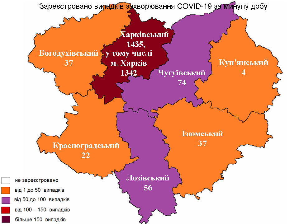 За прошедшие сутки наибольшее количество больных COVID-19 зарегистрировали в Харьковском районе — 1 435 случаев, 1 342 из них — среди жителей Харькова.