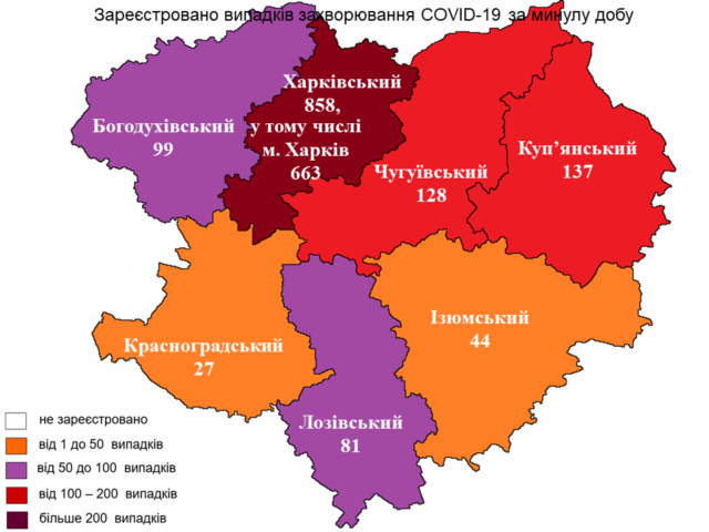 За прошедшие сутки наибольшее количество больных COVID-19 зарегистрировали в Харьковском районе — 858 случаев, 663 из них — среди жителей Харькова.