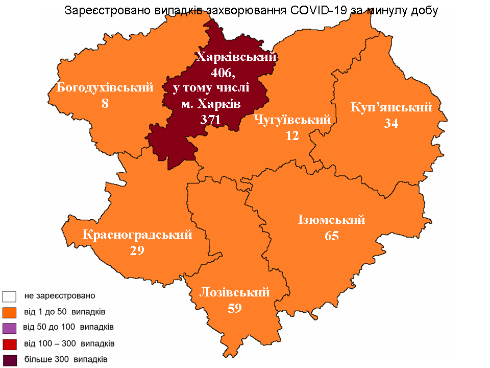 За прошедшие сутки наибольшее количество больных COVID-19 зарегистрировали в Харьковском районе — 406 случаев, 371 из них — среди жителей Харькова.