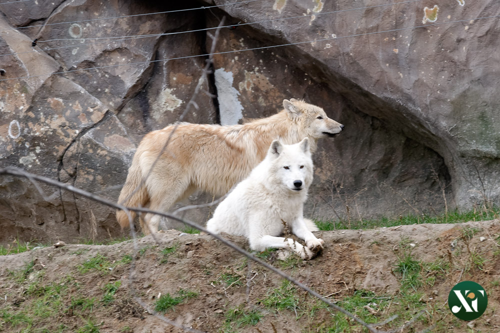 Трое белых полярных волков зимы не боятся и чувствуют себя явно очень комфортно. Волки не обращают внимания даже на нахальных сорок, пытающихся оторвать кусочек от их порций мяса во время кормежки. Сороки тоже не дураки – к находящимся по соседству рысям они за мясом не суются.