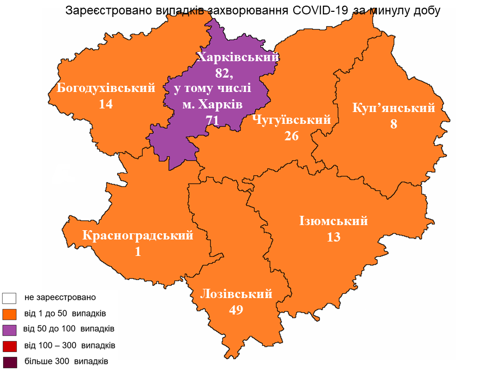 За прошедшие сутки наибольшее количество больных COVID-19 зарегистрировали в Харьковском районе — 82 случая, 71 из них — среди жителей Харькова.