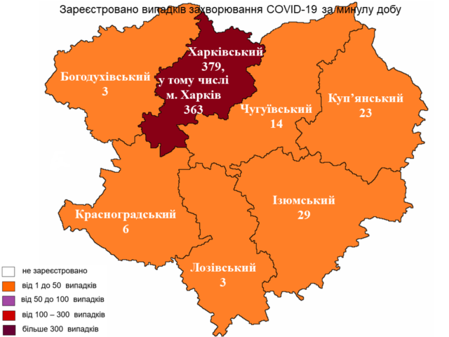 За прошедшие сутки наибольшее количество больных COVID-19 зарегистрировали в Харьковском районе — 379 случаев, 363 из них — среди жителей Харькова.