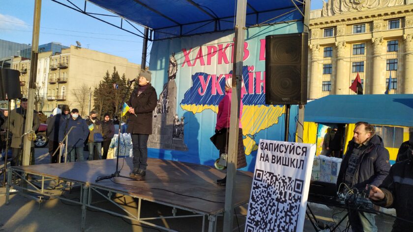 Участники прошли по улице Сумской на площадь Свободы, к палатке «Все для победы», за которой установили сцену. Здесь начался митинг, на сцене выступают лидеры общественного движения г. Харькова.
