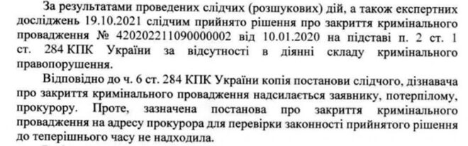 Прокуроры Офиса Генерального прокурора внесли сведения в Единый реестр досудебных расследований по признакам уголовных преступлений, предусмотренных ч. 2 ст. 127 (пытки, совершенные повторно, по предварительному сговору группой лиц), ч. 2 ст. 365 (превышение власти или служебных полномочий работником правоохранительного органа с применением насилия или угрозой применения насилия), ч. 1 ст. 172 (грубое нарушение законодательства о труде) Уголовного кодекса. Досудебное расследование было поручено территориальному управлению ГБР в г. Полтава.