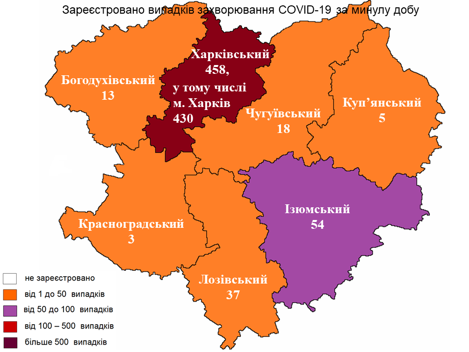За прошедшие сутки наибольшее количество больных COVID-19 зарегистрировали в Харьковском районе — 458 случаев, 430 из них — среди жителей Харькова.
