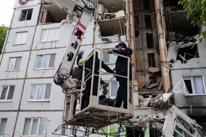 Сегодня, 10 мая, спасатели продолжают разбирать завалы на разрушенных российскими обстрелами многоэтажках в пока еще московском районе Харькова.