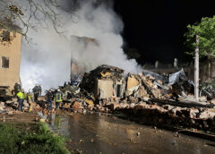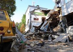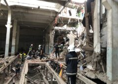 40 спасателей разбирают разрушенное российской ракетой четырехэтажное здание.