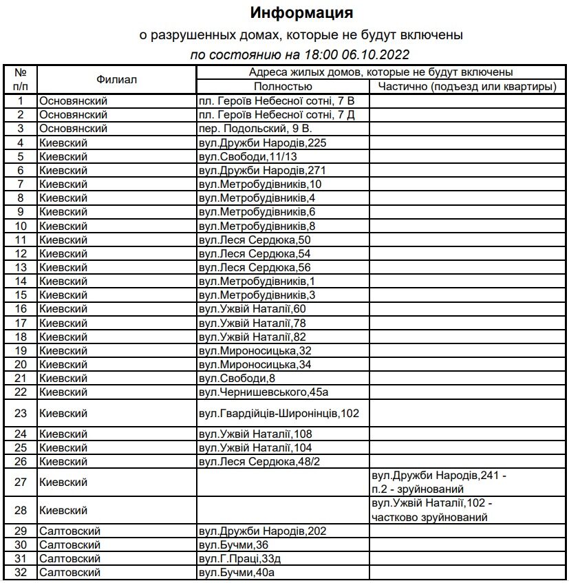 «По состоянию на 18:00 6 октября, 25 таких домов расположены в Киевском районе, 13 домов – в Салтовском, два дома – в Холодногорском, один дом – в Слободском и по три – в Шевченковском, Немышлянском и Основянском районах города», – говорится в сообщении.