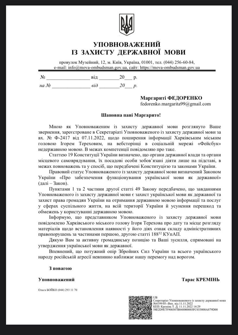 Об этом Харків Times узнал из ответа языкового омбудсмена Тараса Креминя на запрос активистки инициативы «Мова.Харків» Маргариты Федоренко.