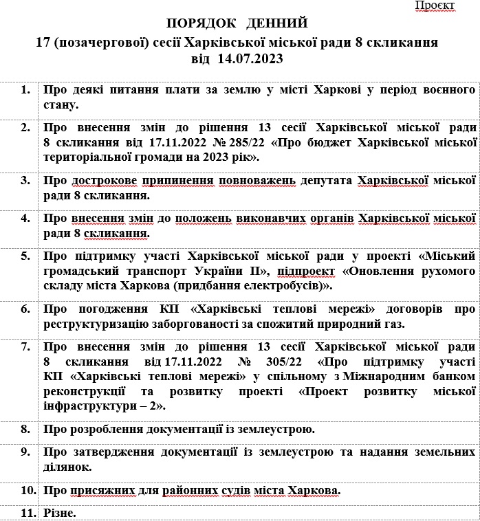 ХѴІІ внеочередная сессия Харьковского городского совета 8-го созыва пройдет 14 июля 2023 года. Заседание проведут в дистанционном режиме.