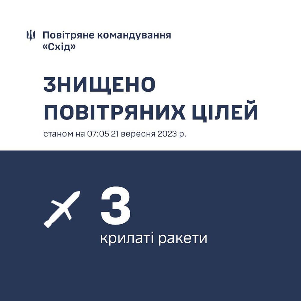 Сегодня, 21 сентября, во время утренней массированной ракетной атаки рф по всей Украине в зоне ответственности Воздушного командования «Восток» в Харьковской области сбиты три русских крылатых ракеты.