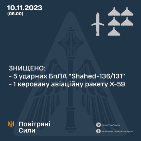 «Силами и средствами Воздушных Сил, во взаимодействии с ПВО Сил обороны Украины, уничтожено пять ударных БпЛА и одну управляемую авиационную ракету Х-59 в пределах Днепропетровской, Харьковской, Николаевской, Полтавской и Киевской областей.», — рассказали в командовании.