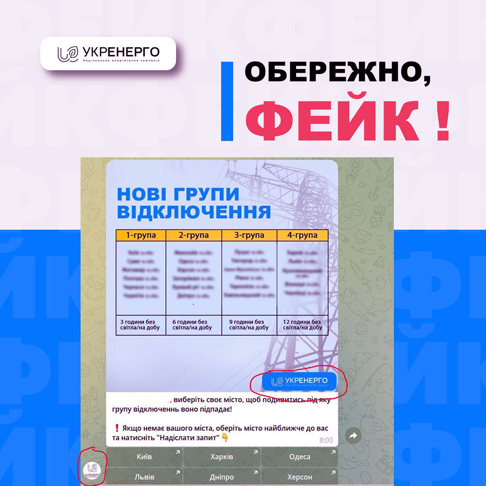 Мошенники вновь создали в Telegram фейковый канал, используя логотип НЭК «Укрэнерго» и публикуют в нем ложные новости.
