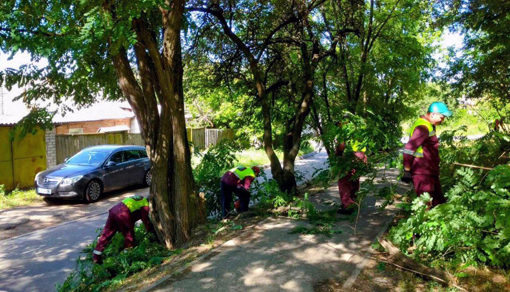 К уборке на местах «прилетов» присоединились и работники КП «Харьковблагоустройство», они убирают битые стекла, мусор, ветки и упорядочивают территорию.
