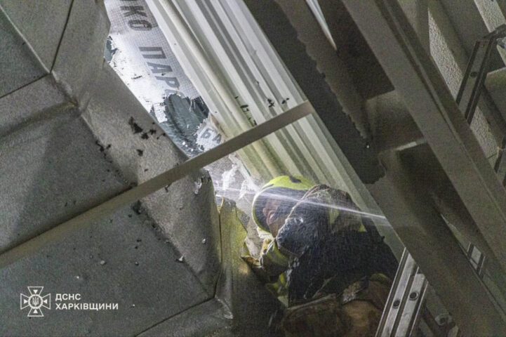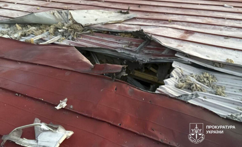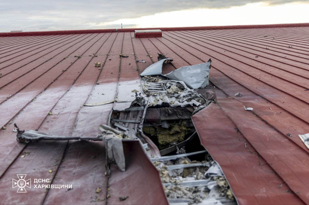 Попадание зафиксировано в крышу здания: повреждены металлическая кровля здания и мебель. Пожара не было.