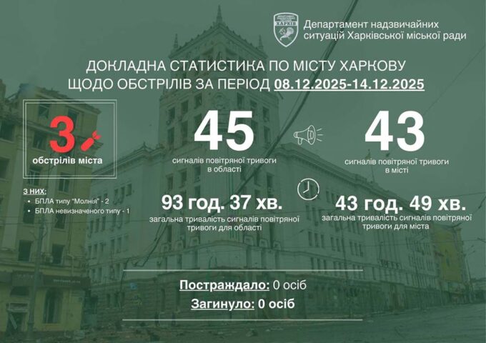 На минувшей неделе сигнал тревоги в Харькове звучал почти 44 часа. Это на 54% меньше, чем по области.