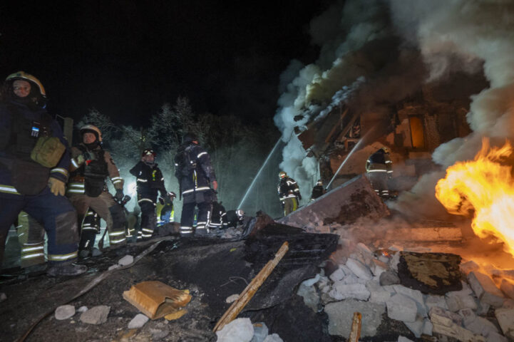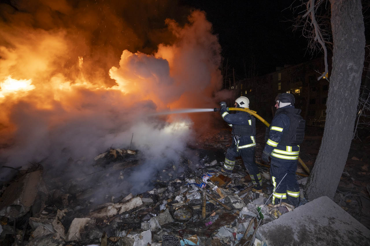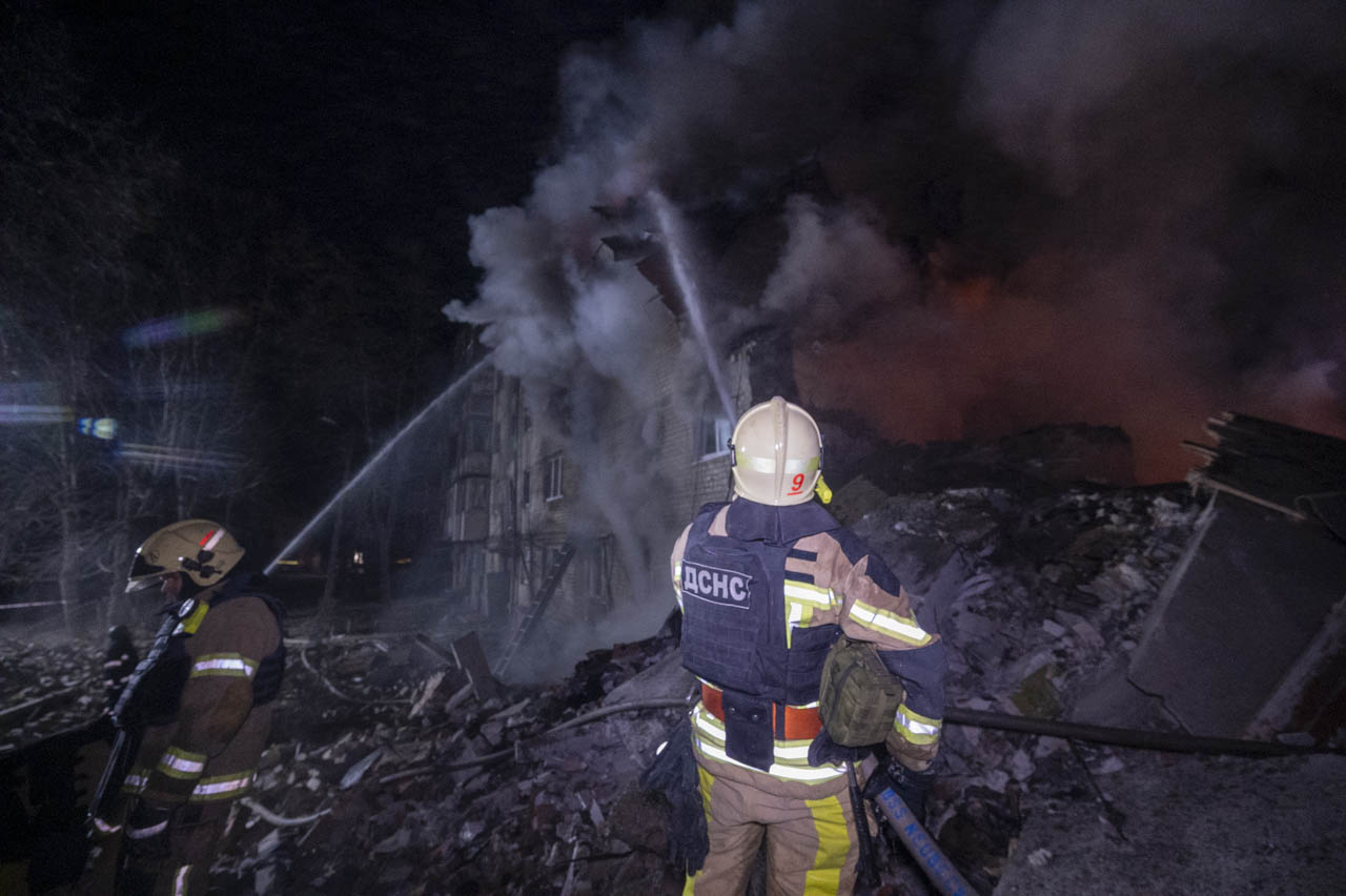 Как передает корреспондент Харків Times, в полуразрушенном ракетой доме во время тушения пожара обрушилась стена между двумя подъездами.
