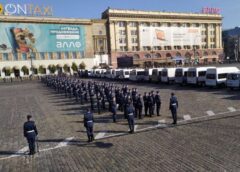 Під сумну і дзвінку мелодію у виконанні військового оркестру на площу з автобусів виносять труни з тілами загиблих.